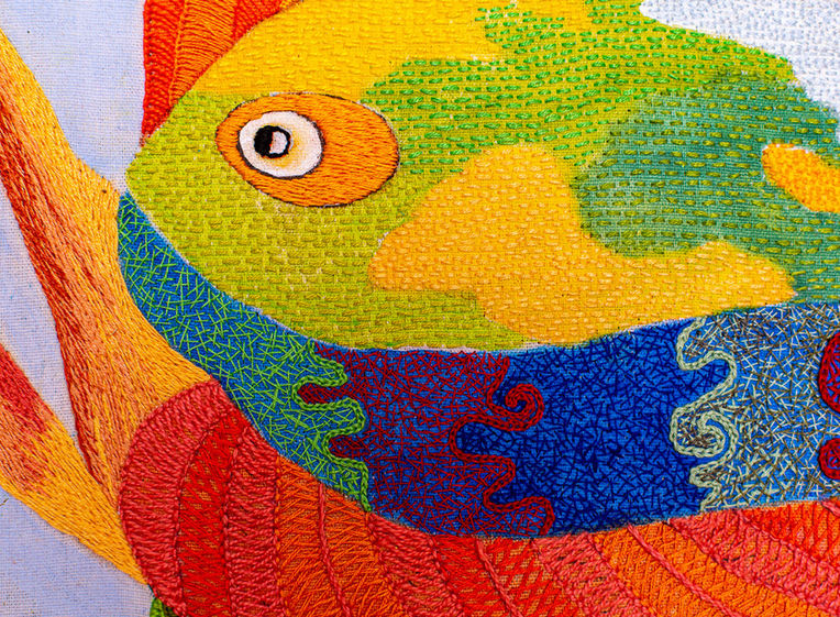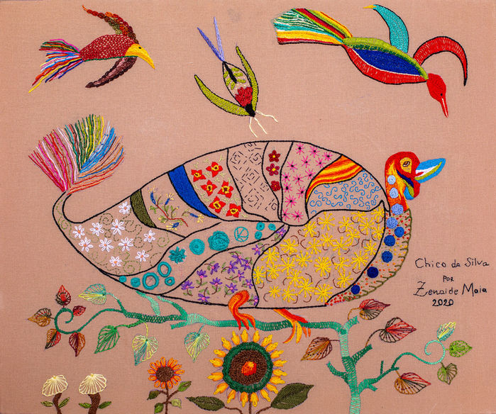 Todavia, se esse quase autodidatismo resultou numa certa inibição visível nas produções de algumas bordadeiras, levando-as a se deixarem prender pela simples incorporação direta de algumas imagens digamos “clássicas” do imaginário de Chico: Galos, Peixes e Dragões, por outro ângulo, talvez o ponto alto da mostra, está na capacidade que quase todas as bordadeiras tiveram de mergulhar no rico mundo das cores vibrantes, das texturas, da incorporação de elementos decorativos do mundo vegetal e mesclá-los com outros elementos zoomorfos de que vemos nas obras de Chico e de seus seguidores, possibilitando o ressurgimento de maneiras, sinais e elementos simbólicos essenciais da nossa cultura.