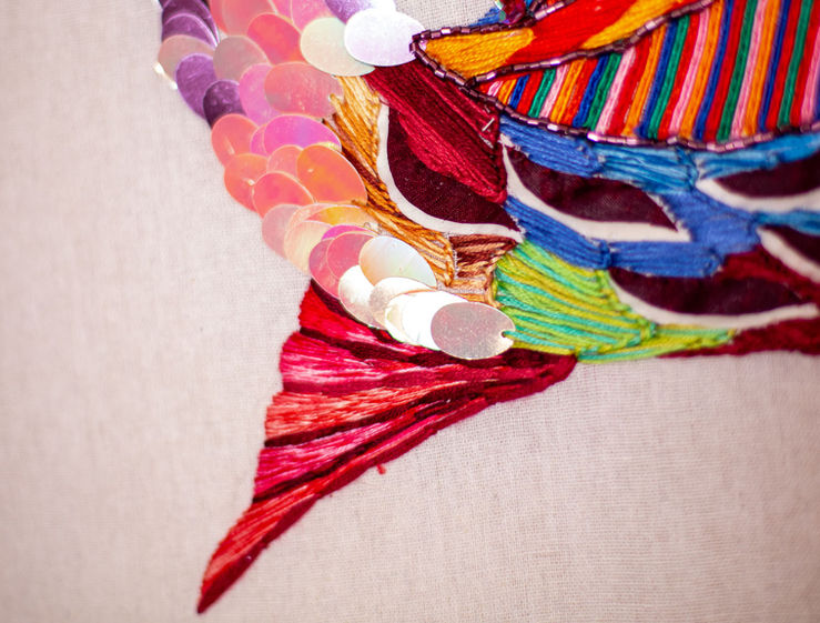Riquíssimos são os contrastes violentos e o colorido intenso criando texturas e o destacado pontilhismo, bem característicos das manifestações artísticas do nosso povo que pode ser percebido em quase todos os bordados da coleção.
